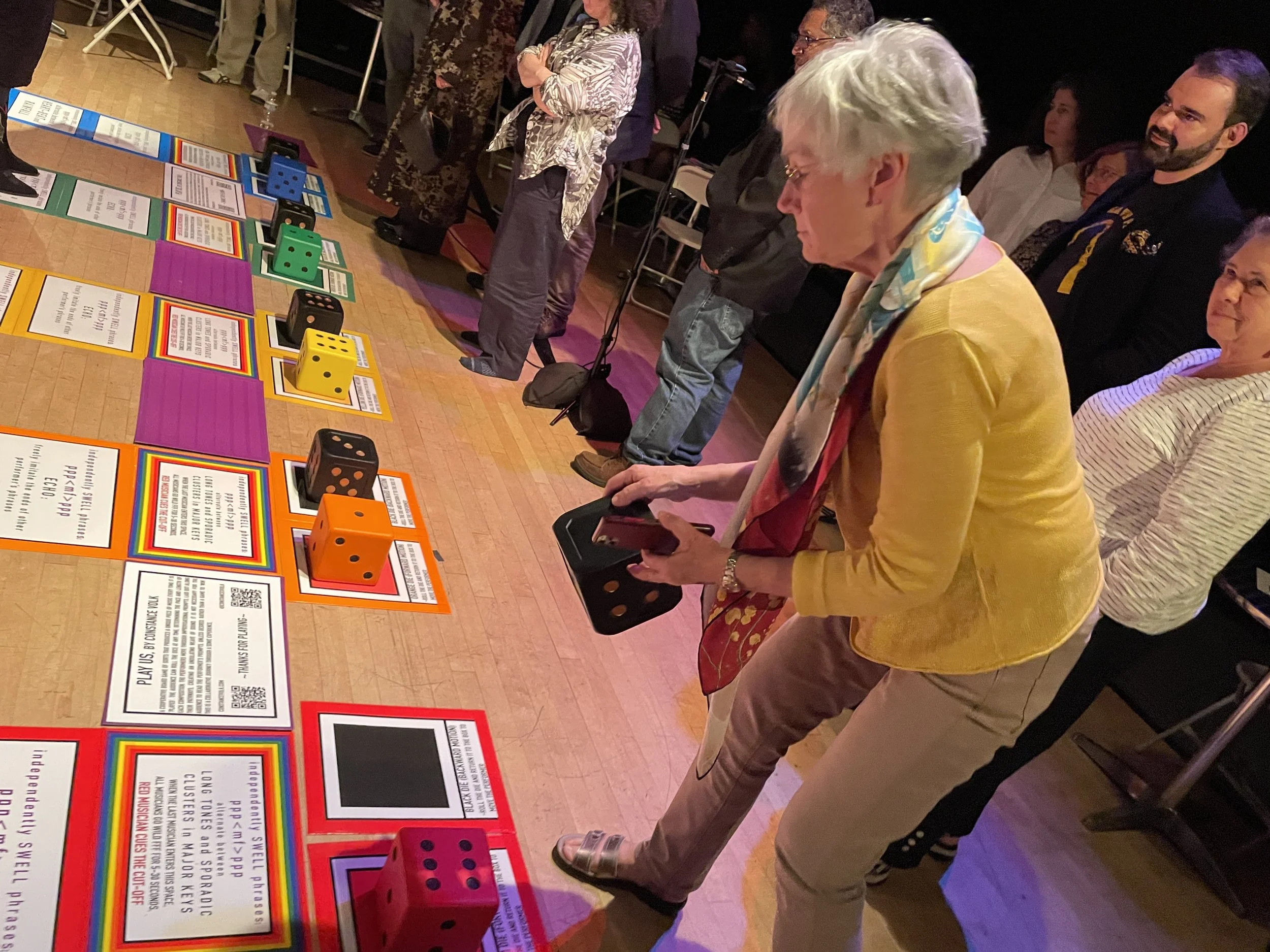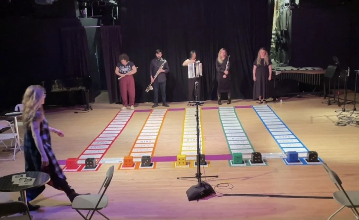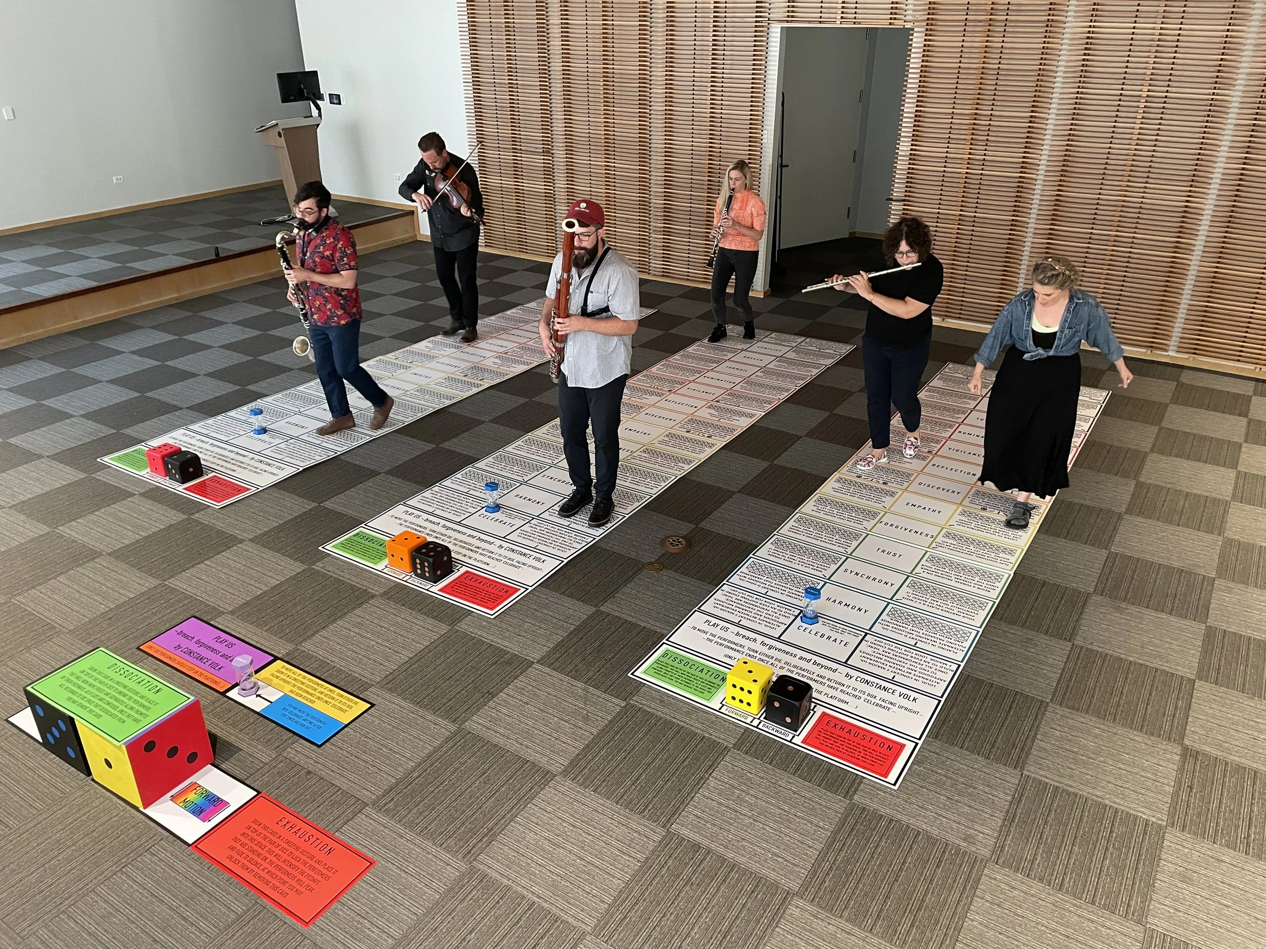 A dice-controlled live-sound installation, created with improvisational-prompt-tiles, which are arranged into pathways on the floor for musicians to walk along, improvising within the guidelines of each tile they land on. A pair of dice controls the movement of each performer. The audience’s collective dice-turning determines the course of the composition.