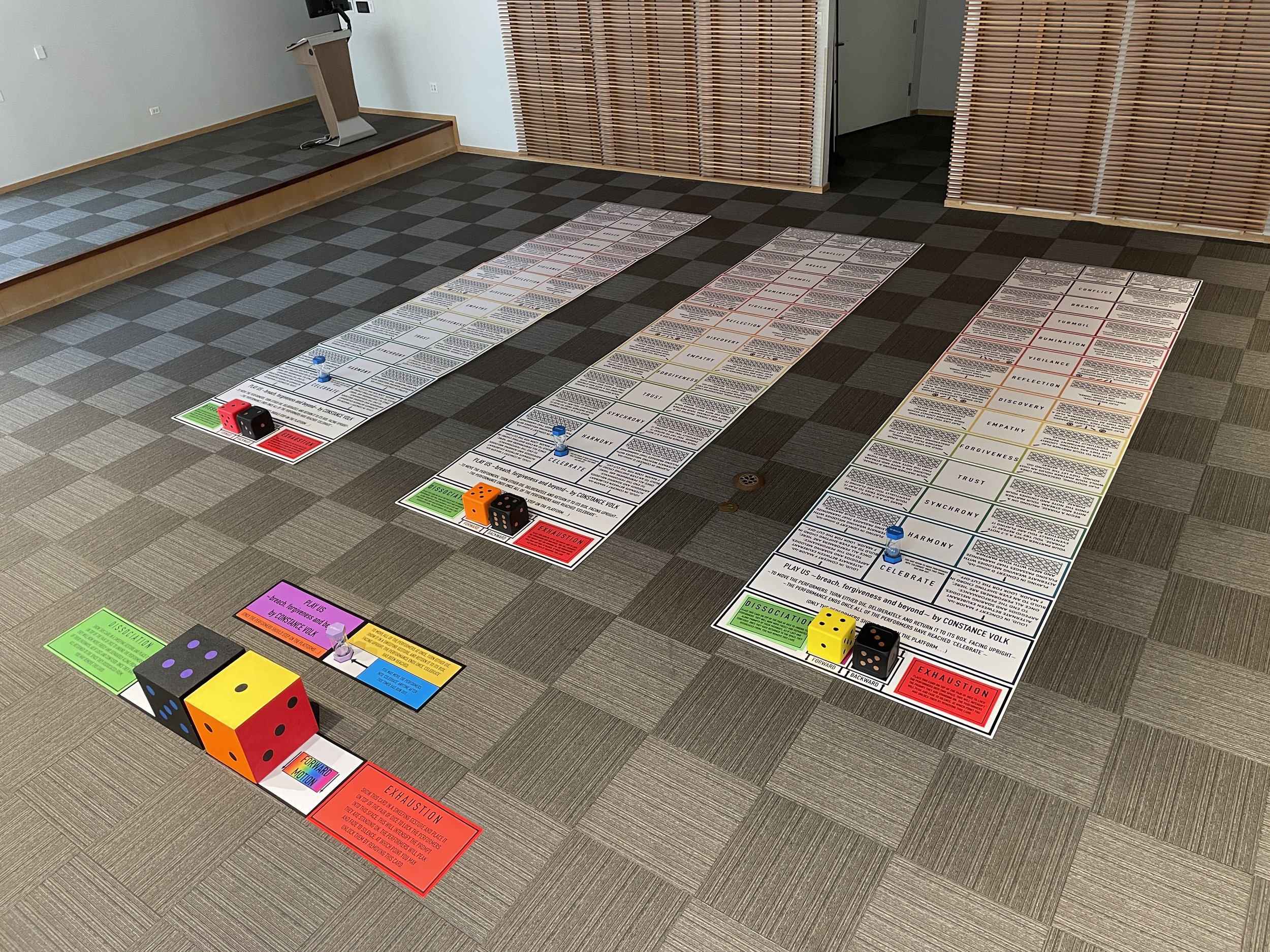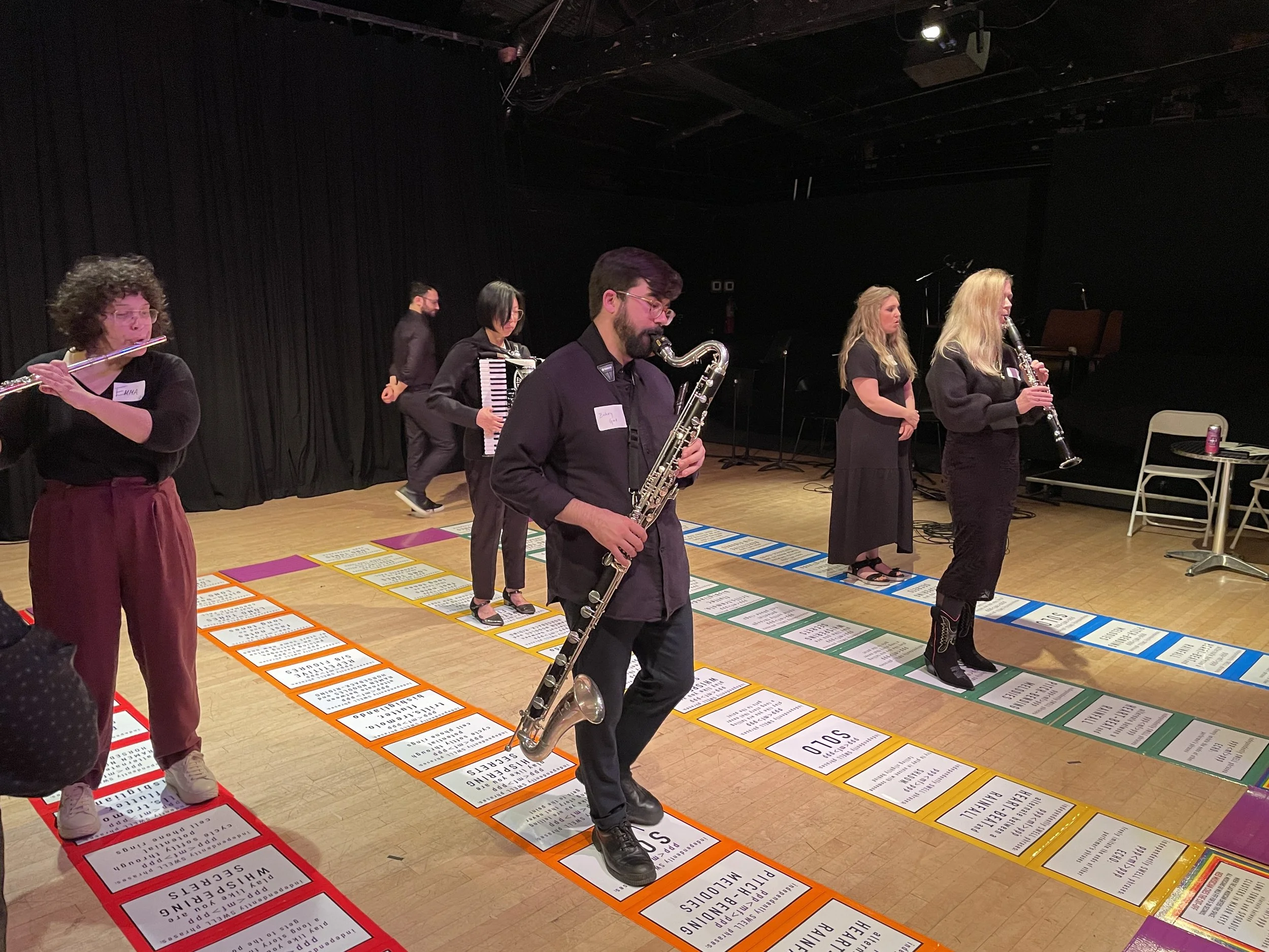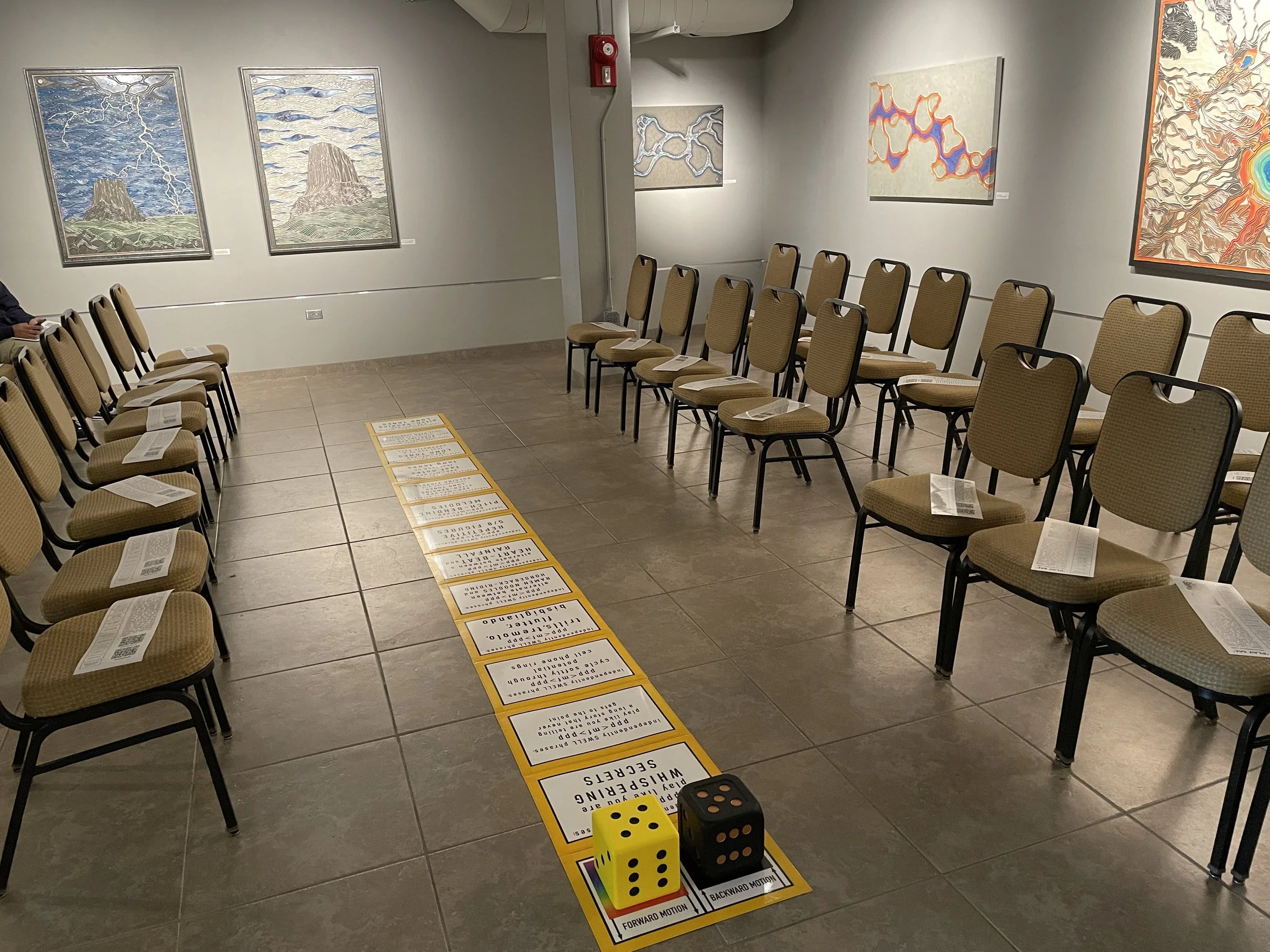 A dice-controlled live-sound installation, created with improvisational-prompt-tiles, which are arranged into pathways on the floor for musicians to walk along, improvising within the guidelines of each tile they land on. A pair of dice controls the movement of each performer. The audience’s collective dice-turning determines the course of the composition.